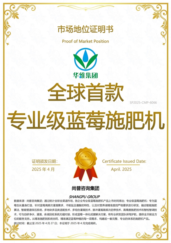 2025年4月,尚普咨询集团有限公司(以下简称“尚普咨询集团”)对蓝莓施肥机市场进行深度调研,经专家和企业调研以及终端销售渠道交叉验证后,给上海华维可控农业科技集团股份有限公司颁发了“全球首款专业级蓝莓施肥机”的市场地位声明认证!